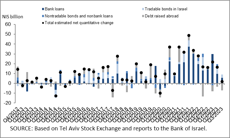 - The balance of business sector debt increased by about 1 percent (about NIS 12 billion) during the quarter, to about NIS 1.3 trillion. This was mainly due to the depreciation of the shekel against the US dollar and the increase in the Consumer Price Index. It was also due to net debt raised, though this amount was at lower volumes than in previous quarters.