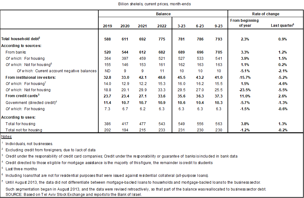 - The increase in outstanding household debt was due to an increase in housing debt, mostly to banks. This debt increased by a rate slightly higher than in the previous quarter—about 1.3 percent compared to 1.2 percent, but the rate remains lower than in the previous four years. The decline in nonhousing debt that began at the beginning of the year continued (about NIS 0.4 billion, to about NIS 230 billion), as a result of a decrease in the balance of debt to institutional investors, which was slightly offset by a slight increase in the balance of debt to credit card companies. The balance of debt to the banks remained unchanged during the quarter, at about NIS 163 billion.