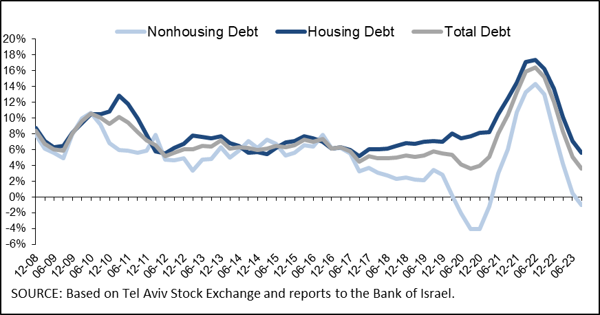 - The decline in nonhousing debt that began near the beginning of the year continued. Nonhousing debt declined by about NIS 0.4 billion to about NIS 230 billion in the third quarter, and for the first time since the first quarter of 2021, the year-over-year growth rate of this balance was negative.