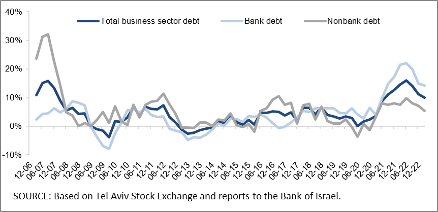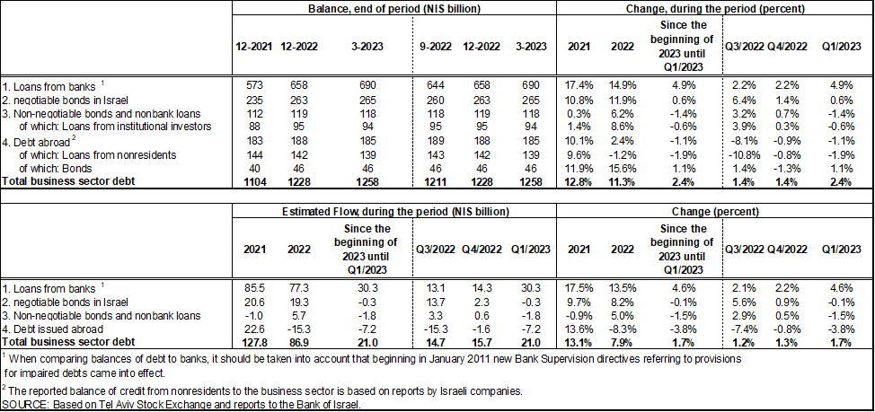 - In the first quarter of 2023, the balance of business sector debt continued to increase, by approximately NIS 30 billion (2.4 percent), to a level of about NIS 1.3 trillion. However, the slowdown in the balance’s year-over-year growth rate, which began in the second half of 2022, continued.