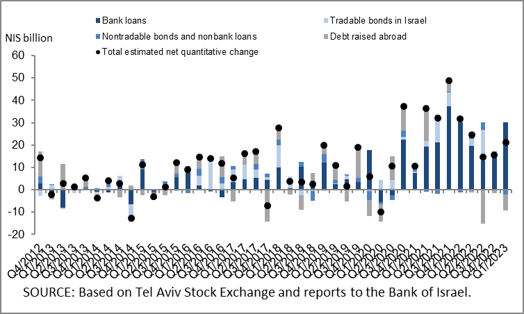- The year over year growth rate of the balance of debt to banks and to nonbank lenders continued to decline in the first quarter as well, following a decline that began in the second half of 2022, but it remains high—debt to banks grew by an annual rate of about 14 percent, compared to 15 percent in the preceding quarter, and debt to nonbank lenders grew by about 5 percent compared with 7 percent. In the past two years, the annual growth rate in the balance of debt to banks has been higher than the annual growth rate of debt to nonbank lenders.