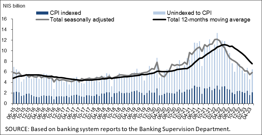 - In the first quarter of 2023, new mortgages taken out totaled about NIS 19 billion, lower than in the corresponding quarter of the previous year (about NIS 35 billion). In April 2023, the decline in new mortgages taken out that began in May 2022 continued, and they totaled about NIS 5.5 billion, seasonally adjusted. However, in May 2023 there was a slight increase in new mortgage volume, totaling about NIS 5.9 billion, seasonally adjusted (Figure 6).