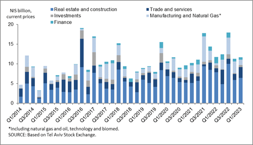 - In April 2023, the business sector issued bonds worth about NIS 1.2 billion, all through tradable bonds. Companies from the real estate and construction industry continued to lead issuance in that month as well—about 74 percent of total issues in those months were carried out by them.