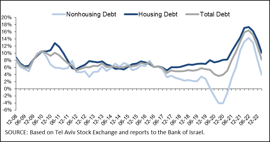 The increase in outstanding housing debt continued (about NIS 7 billion), mostly to banks, though at a lower pace than that in the previous quarter—1.2 percent, compared to 1.7 percent; for the first time since the third quarter of 2020 nonhousing debt declined, by about NIS 2 billion, to NIS 231 billion, as a result of a decrease in the balance of debt to institutional investors that was partly offset by an increase in the balance of debt to credit card companies. The balance of nonhousing debt to banks remained unchanged in the quarter, at about NIS 161 billion.