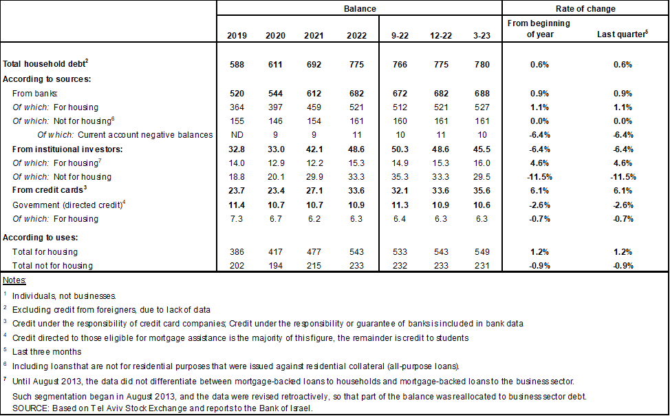 - The growth in the balance of households’ outstanding debt continued in the first quarter of 2023, to NIS 780 billion, (an increase of about NIS 5 billion). However, the slowing in its rate of growth continued in the quarter, about 0.6 percent compared to 1.3 percent in the previous quarter.