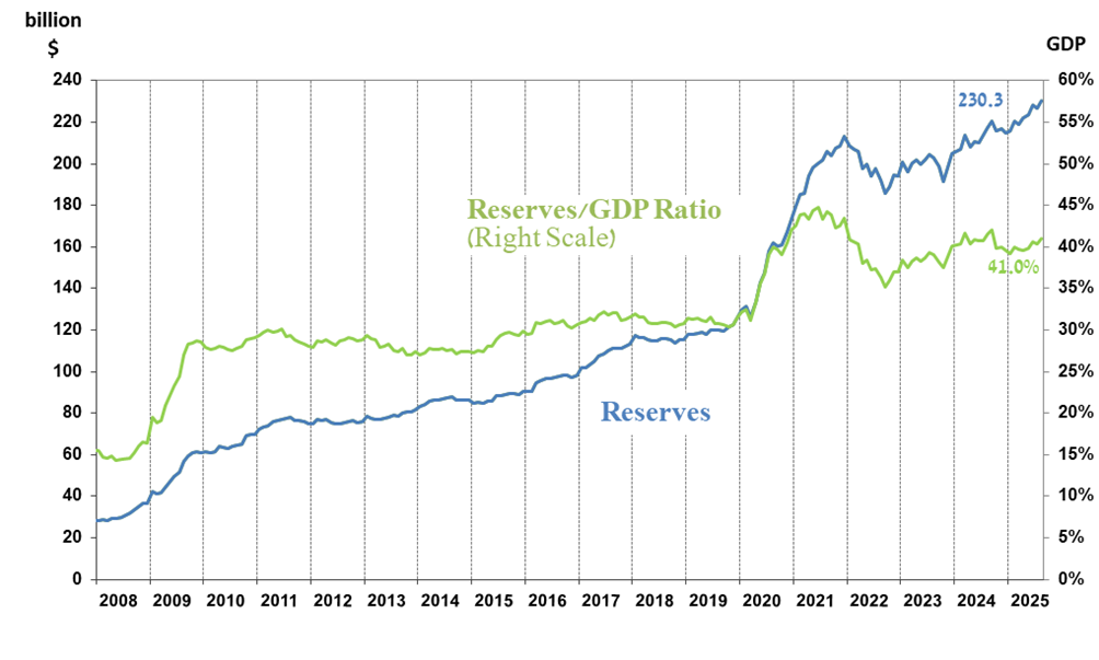 Israel’s foreign exchange reserves at the end of August 2025 stood at $230,321 million, an increase of $3,553 million from their level at the end of the previous month. The level of the reserves relative to GDP was 41.0 percent (Figure 1).