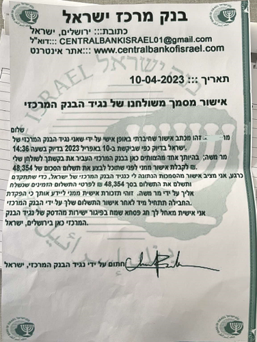 The Bank of Israel and the Israel Police call on the public to take note of attempts of fraud and impersonation, and bring to the public’s attention that criminal factors try to carry out, from time to time, fraudulent activities with the goal of taking money from customers deceitfully by impersonating, among others, representatives of the Bank of Israel, commercial banks and credit card companies, and the Israel Police. At times, the hostile factor sends forged certificates showing a false identity, such as a police officer’s document, or a letter “on behalf of” the Bank of Israel (an example is attached for illustration).