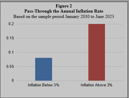 The economic literature indicates a positive relation between the inflation rate and the pass-through rate, derived from agents’ perception that price changes are less persistent in a low-inflation environment, making the pass-through weaker. Given Israel's rising inflation, the researchers investigated whether the pass-through from the exchange rate to prices intensifies with higher inflation in Israel as well. Similar to the findings in the economic literature, their findings indicate that Israel's pass-through has indeed increased alongside the notable rise in inflation since 2022. The researchers also directly assessed the relationship between the pass-through rate and the annual inflation rate (Figure 2). They found evidence that the pass-through increases once the inflation rate exceeds the upper bound of the target range in Israel. When inflation is below 3 percent, the pass-through is lower (approximately 8 percent), and the pass-through strengthens significantly (to 20 percent) when inflation exceeds 3 percent.
