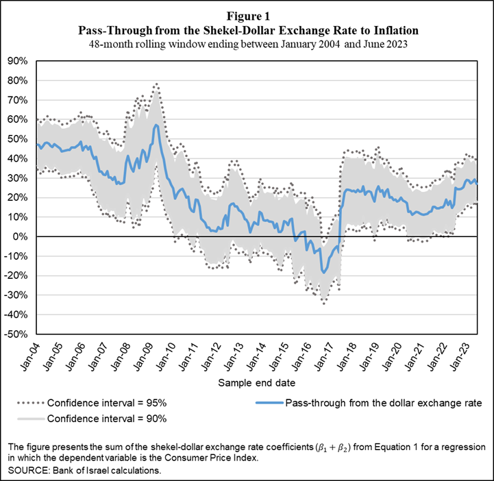 - Since the second half of 2022, it appears that the pass-through from the shekel/dollar exchange rate to overall inflation in Israel has strengthened. While the average pass-through in samples ending between June 2017 and Jun 2022 was slightly less than 20 percent, the pass-through in samples ending between the end of 2022 and mid-2023 was slightly above 25 percent.