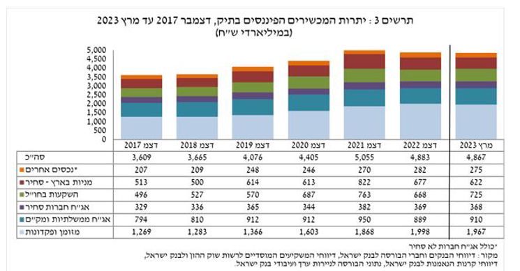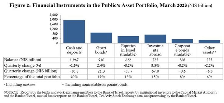 - In the first quarter of 2023, the balance of the public’s financial assets portfolio declined by approximately NIS 15 billion (0.3 percent), to about NIS 4.87 trillion, further to the overall decline in 2022.