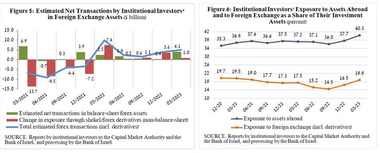 Exposure to foreign currency—During the first quarter of 2023, and further to the trend since the beginning of 2022, institutional investors made net purchases of foreign currency assets, totaling about $5.1 billion—purchases totaling about $4.1 billion in assets denominated in and linked to foreign currency (mainly in foreign bonds, demand deposits in Israel denominated in foreign exchange, and futures and options), and net purchases of foreign exchange through derivative financial instruments totaling about $1 billion, meaning a decrease in futures transactions for the sale of foreign exchange.