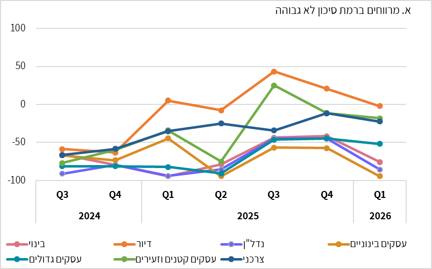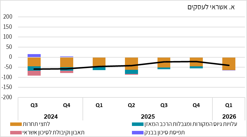 - ברביע הראשון של 2026 נמשכה ההקלה במרווחי האשראי ברמת סיכון לא גבוהה בכל המגזרים, ובמרווחי האשראי ברמת סיכון גבוהה לא דווח על שינוי בכל המגזרים מלבד אשראי לעסקים קטנים שלגביו דווח על הקשחה מסוימת.
