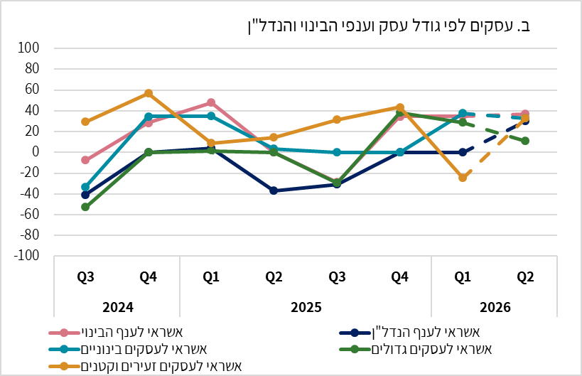 הממצאים המתפרסמים כאן מצרפיים ומתייחסים לכלל התאגידים הבנקאיים. הם מיוצגים באמצעות מאזני נטו משוקללים[1], המסכמים את השינוי שחל ברביע הראשון של 2026 לעומת הרביע הקודם והשינוי הצפוי ברביע השני של 2026 לעומת הרביע הראשון של 2026. חשוב לציין שנתוני הסקר לרביע הראשון של 2026 משקפים את ההתפתחויות שהיו בשגרה ללא ההשפעות שעלולות להיות למבצע "שאגת הארי", שהחל בחודש מרץ.