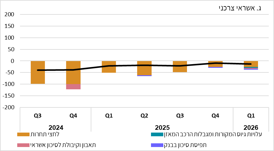 מבחינת ההשפעה של גורמים שונים על הביקוש לאשראי נראה שמימון פרוייקטים בליווי סגור היה הגורם לגידול בביקוש לאשראי לענף הבינוי ברביע הראשון של 2026 (תרשים 2). מהדיווחים של הבנקים התברר גם שצמצום ההוצאה על מוצרים בני קיימא היווה גורם לירידה בביקוש לאשראי צרכני.