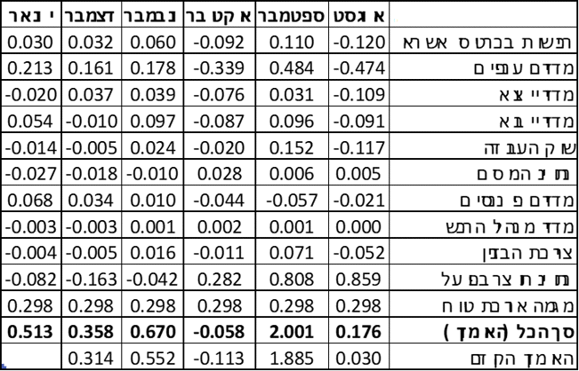 * הלוח מציג את התרומה של כל קבוצת רכיבים למדד החודשי, כך שהאומדן החודשי מהווה סכום של תרומת כל אחד מהרכיבים המפורטים בלוח. חלק מהנתונים הגולמיים משפיעים על האומדן החודשי בפיגור או על אומדני כמה חודשים.