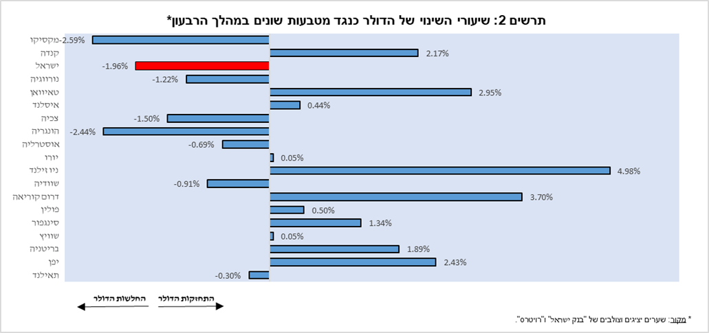 במהלך הרבעון נרשמה מגמה מעורבת בדולר מול רוב המטבעות העיקריים בעולם (תרשים 2). בין היתר התחזק הדולר בכ-2.2% מול הדולר הקנדי ובכ-1.9% מול הפאונד הבריטי, אך נחלש בכ-3.7% מול הוון הדרום קוריאני ובכ-5.0% מול הדולר הניו זילנדי.