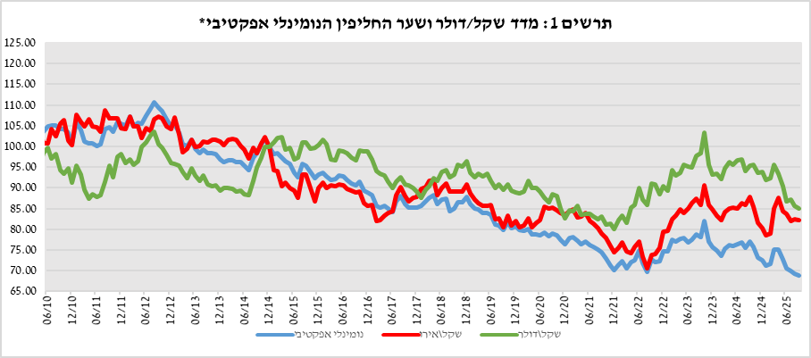 במהלך הרבעון השלישי של שנת 2025 התחזק השקל בכ-2.0% מול הדולר ובכ-1.9% מול האירו, על רקע הפסקת האש בעזה שתרמה לירידה בפרמיית הסיכון של ישראל. כמו כן, התחזק השקל ב-2.6% מול מטבעות שותפות הסחר העיקריות של ישראל, כפי שמשוקלל במדד שער החליפין הנומינאלי האפקטיבי.
