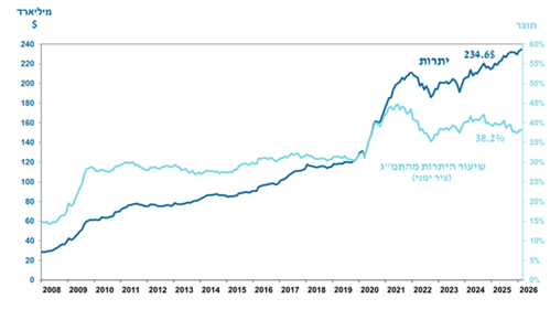 יתרות מטבע החוץ הסתכמו בסוף חודש פברואר 2026 בסך 234,553 מיליוני דולרים, גידול בסך של 1,511 מיליוני דולרים לעומת סוף החודש הקודם. רמת היתרות ביחס לתוצר המקומי הגולמי עמדה על 38.2 אחוזים (איור 1).